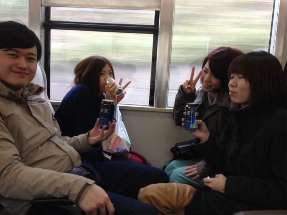 電車内では真昼間っからビール片手にご機嫌なみんな。